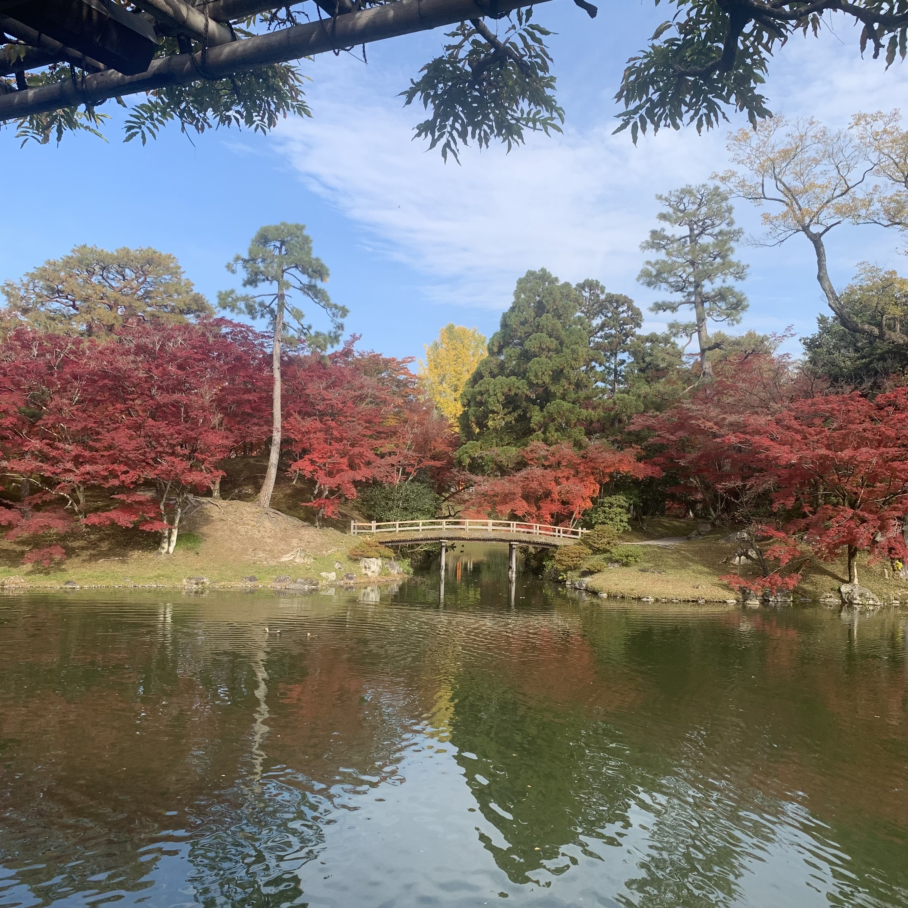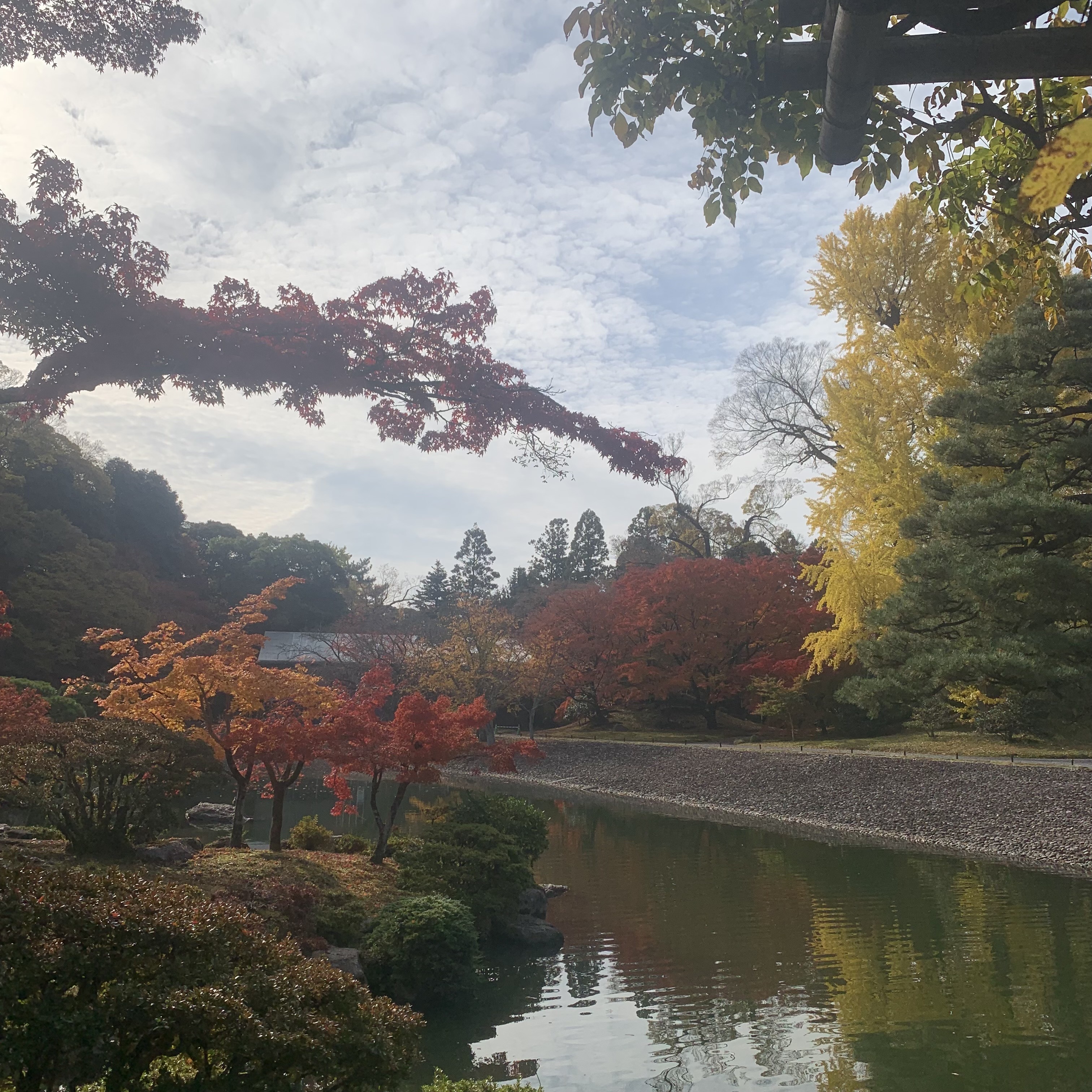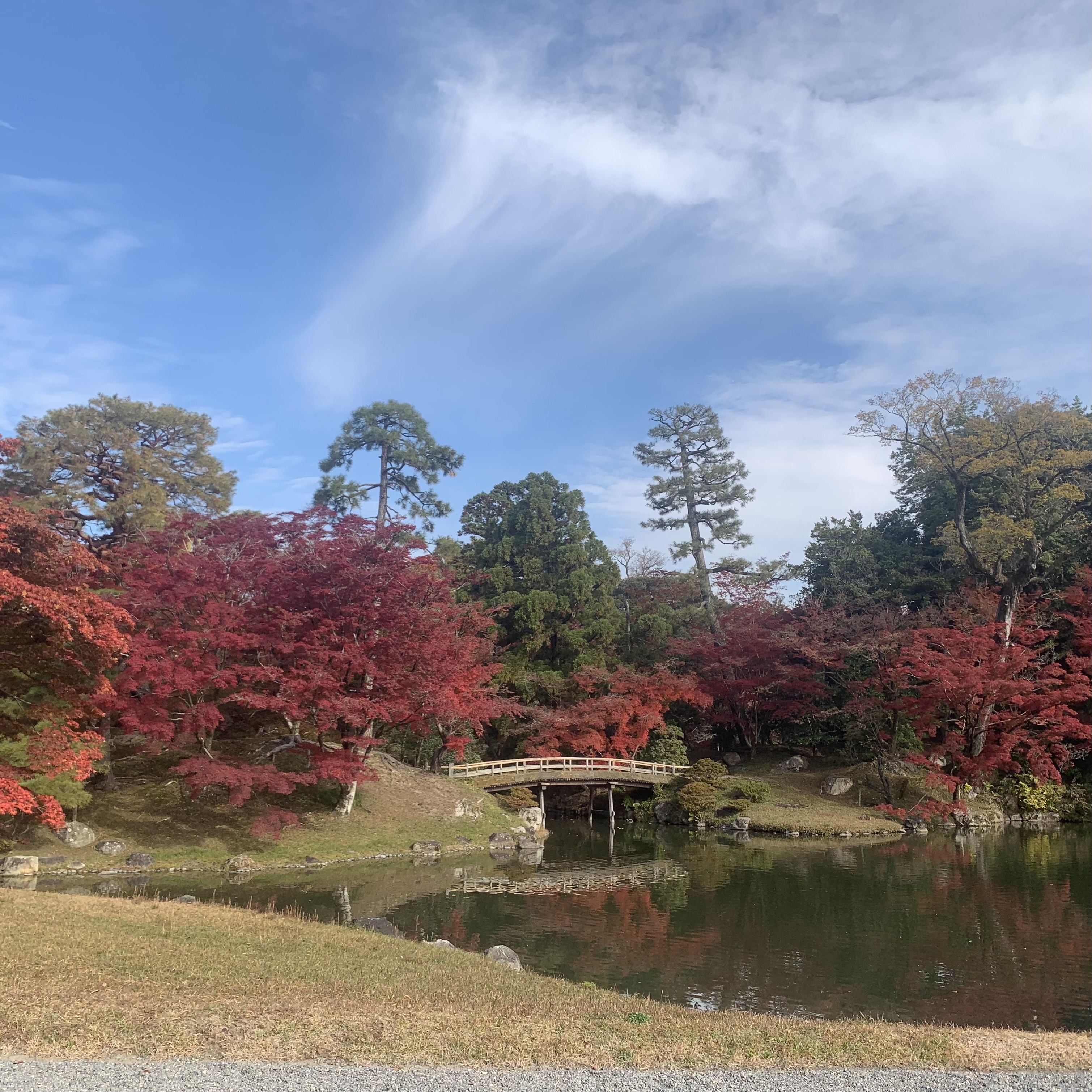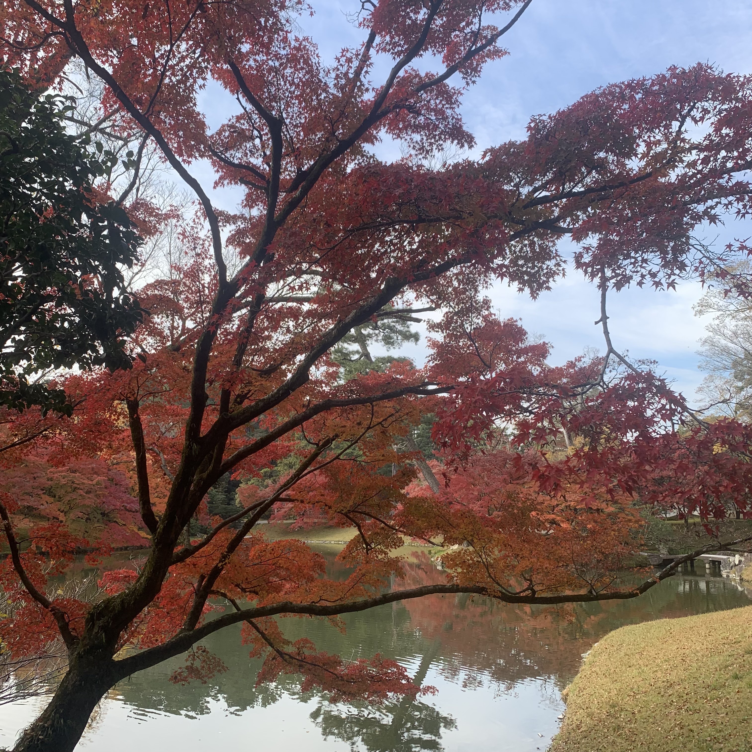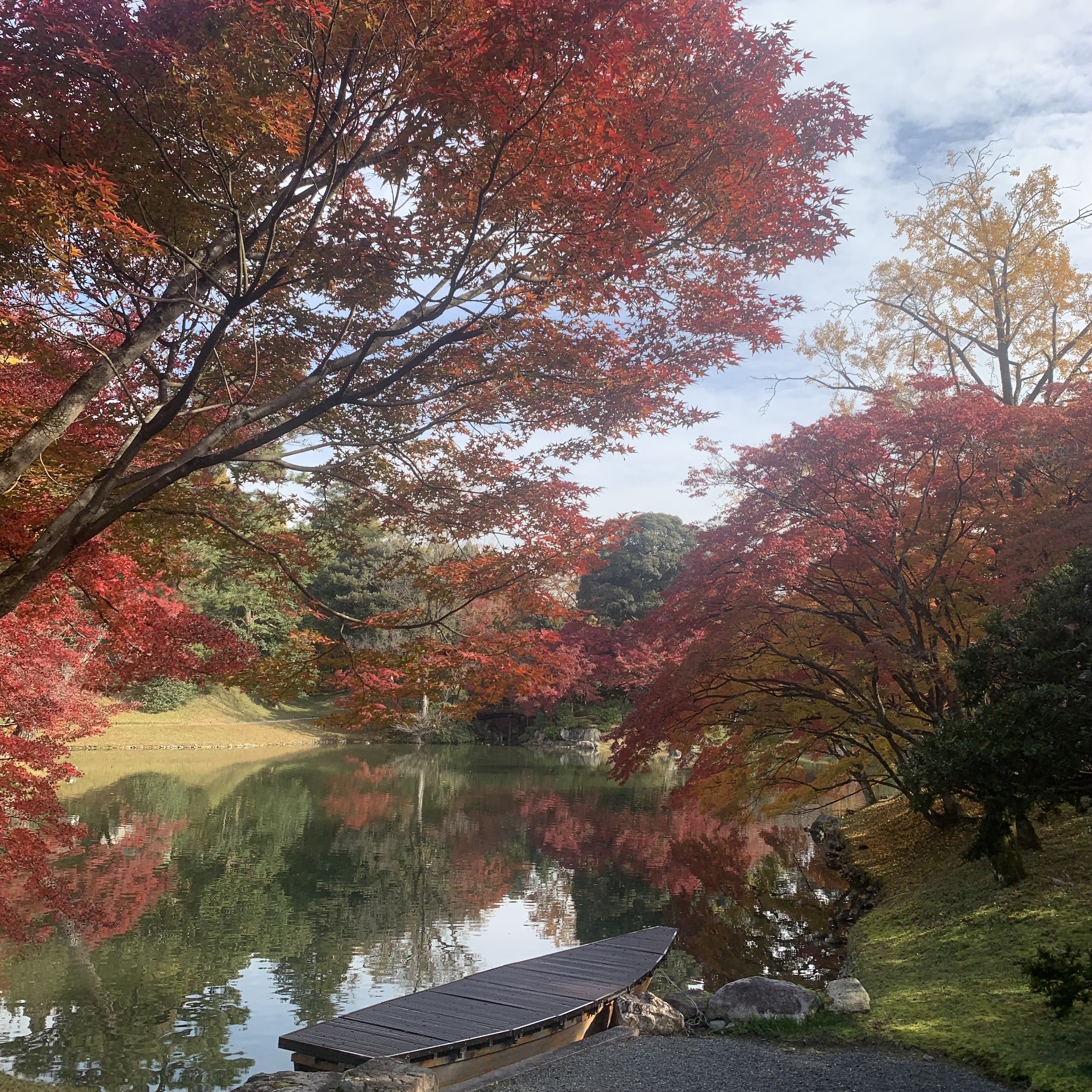 京都仙洞御所の紅葉は、静謐な空気に包まれながらゆっくりと色づき、まるで絵巻物の一場面のように広がります。深みのある朱や黄金色の葉が、庭園の白砂や苔の緑と見事に調和し、季節の移ろいを優雅に映し出します。水面に映る紅葉はさらに風情があり、そよ風に揺れるたびに色彩がきらめき、訪れる人の心を穏やかにしてくれます。
