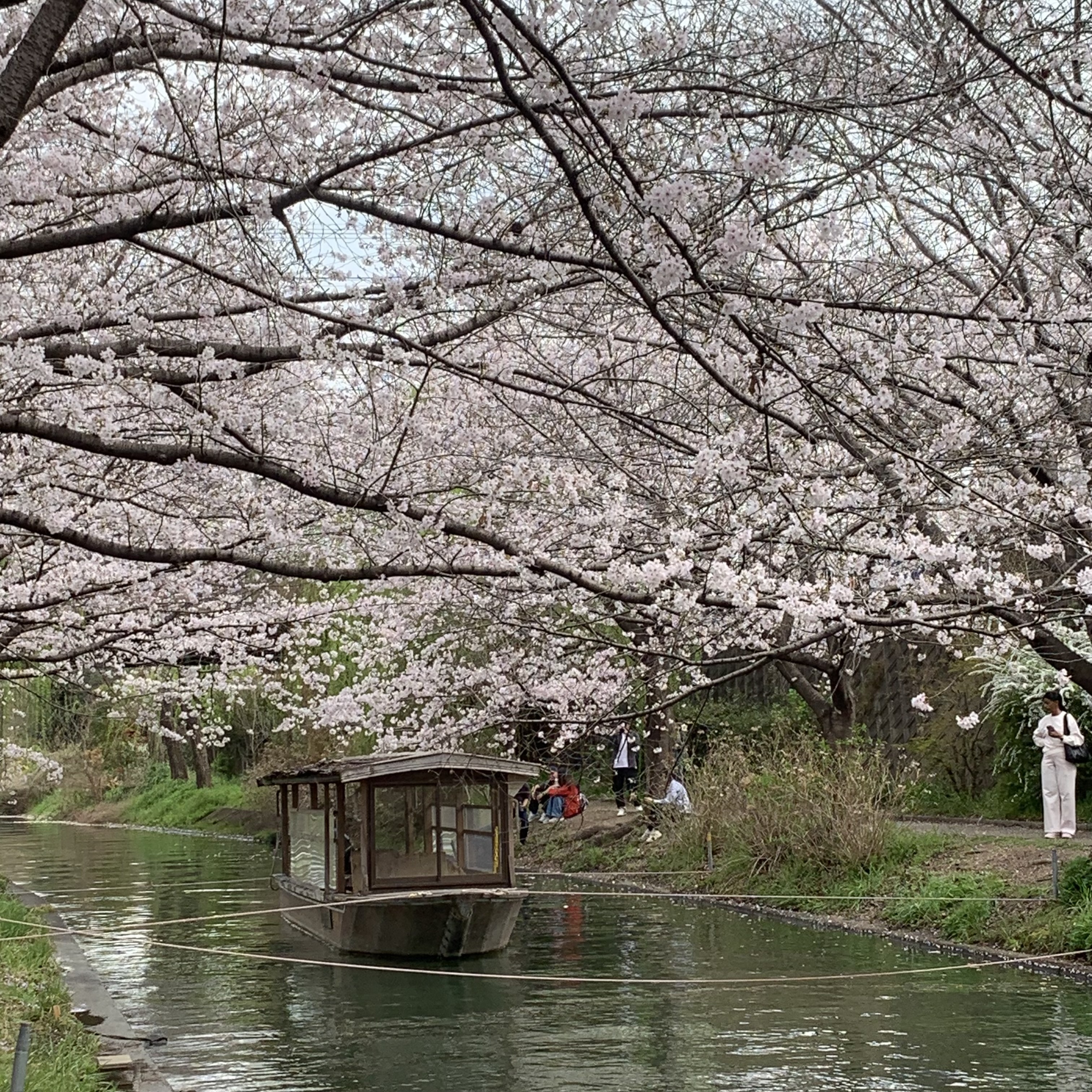 岸辺では、思い思いに春を楽しむ人々の姿が見られ、写真を撮る方や、ゆっくりと散策を楽しむ方の笑顔が印象的です。舟に揺られながら眺める景色は、陸からとはまた異なる趣があり、水面に映る桜と空が一体となって、幻想的な春のひとときを演出します。