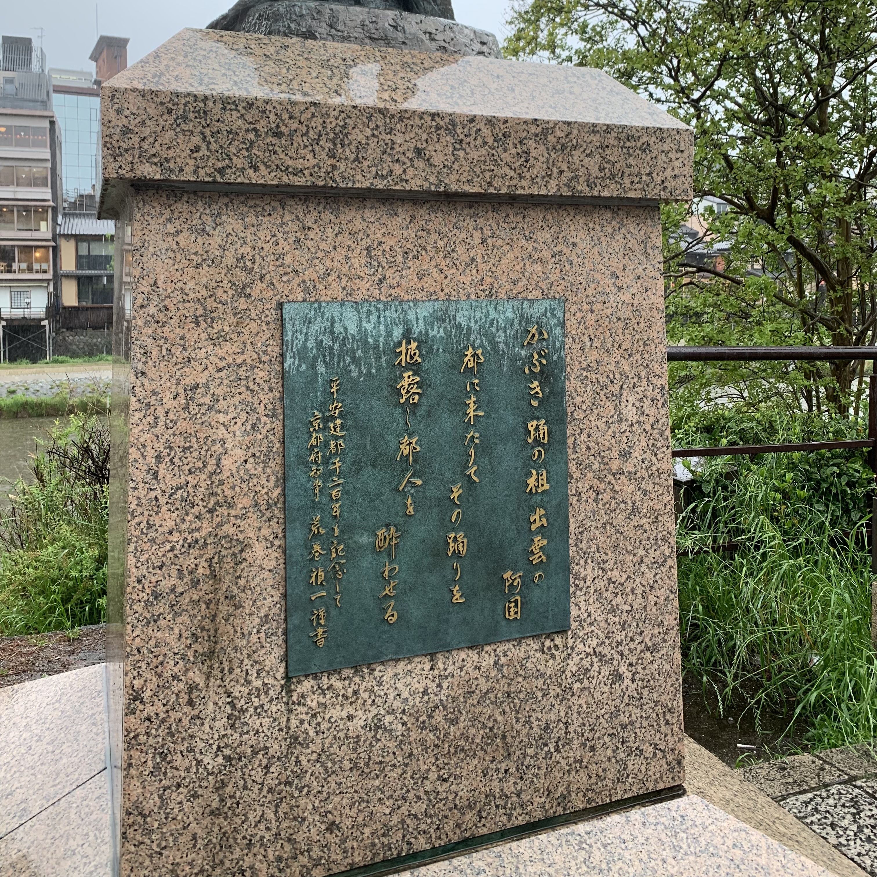 出雲阿国像は、日本の伝統芸能である歌舞伎の起源を今に伝える象徴的な存在である。この像は1994年、「歌舞伎発祥400年」を記念し、京都洛中ライオンズクラブによって建立されたもので、男装し刀を帯び、ロザリオを掛けた阿国の特徴的な姿が表現されています。